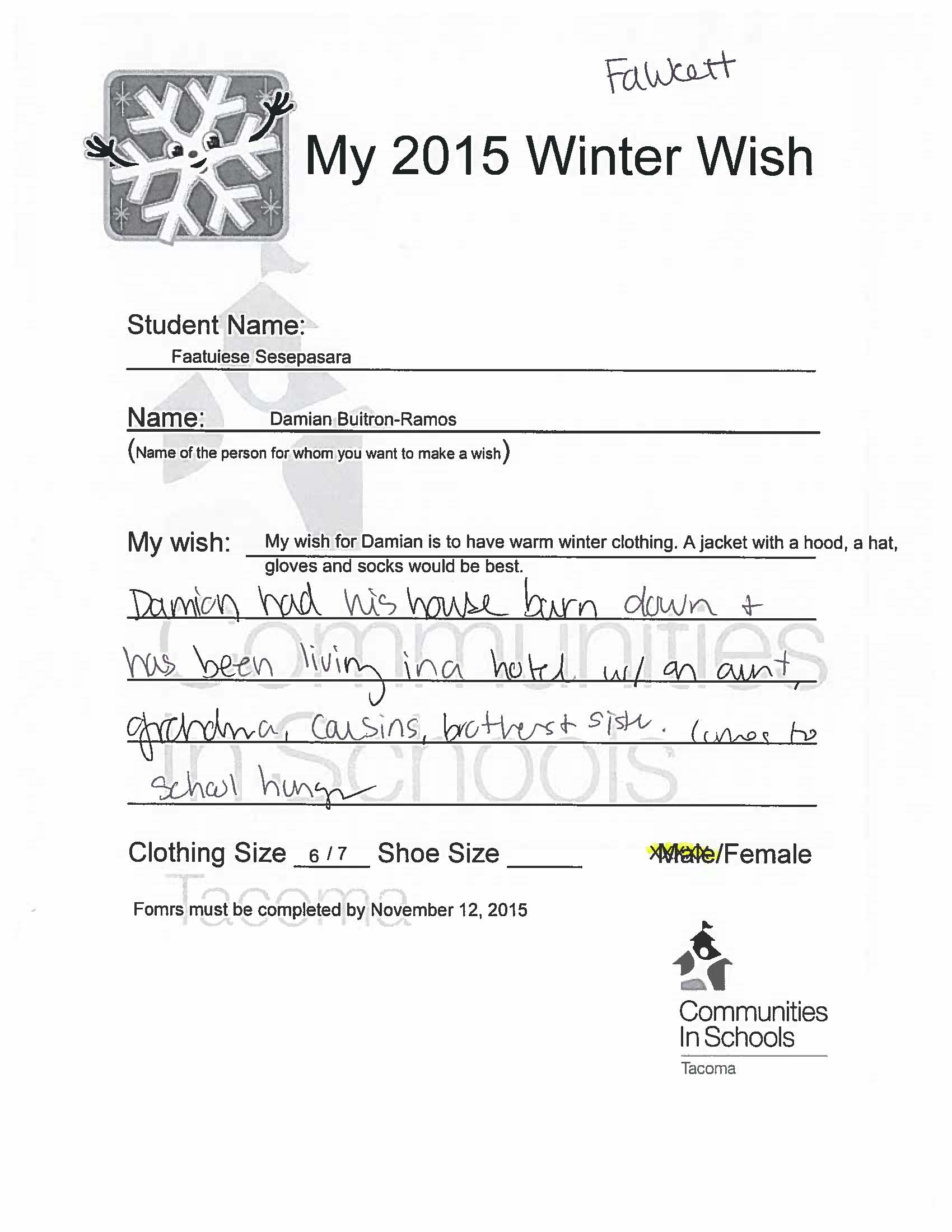 Every year we partner with local organizations and businesses to help make the Holiday Season special for low-income and homeless families in Tacoma. Winter Wish is an opportunity for students to express how a loved one could use assistance during this difficult time of year. This Winter, we have over 100 Winter Wishes that we hope to grant to these families. These wishes include winter clothing and accessories, books, food, and toys.